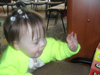 She waves paka (bye bye) and at one point, I was holding her - and Brandon was standing next to us - and she turned to everyone else in the room, and waved bye bye to them - she was ready to go! :) Oh sweet girl if only it was that easy!!! When the time came for us to go, they were trying to get her to tell us paka - and her little face fell and she looked SO sad. She refused to wave, even when they were trying to hold her arm up. We'll be back tomorrow sweet girl!! :)